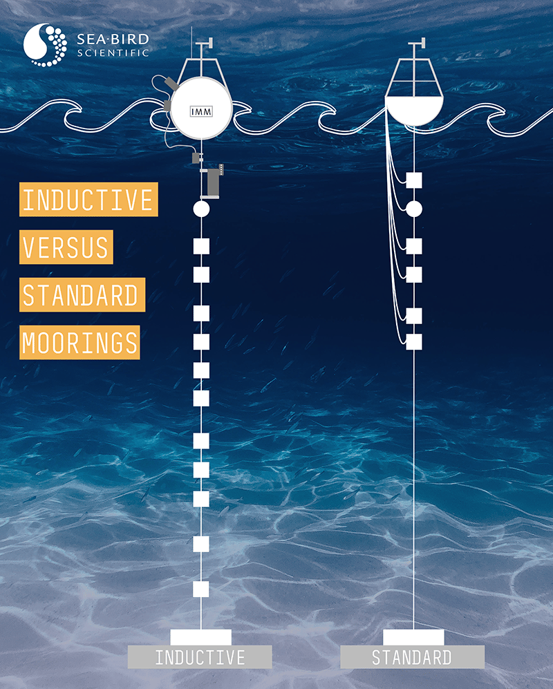 The surface buoy contains a controller that communicates via RS-232 to a Sea-Bird Scientific surface modem, either the Inductive Modem Module (IMM) or the Surface Inductive Modem (SIM). The surface modem converts the RS-232 signals to DPSK, send these commands via a through-hull bulkhead connector to the Sea-Bird Scientific Inductive Cable Coupler (ICC), which transmits this signal along the mooring line. As with the IM instruments, the ICC simply clamps anywhere along the plastic-jacketed portion of mooring cable. The underwater IM instruments receive this signal. They take a sample, return their data via the mooring cable, where it travels from the ICC, to the IMM, gets converted to RS-232, and is sent to the buoy controller for wireless transmission.
