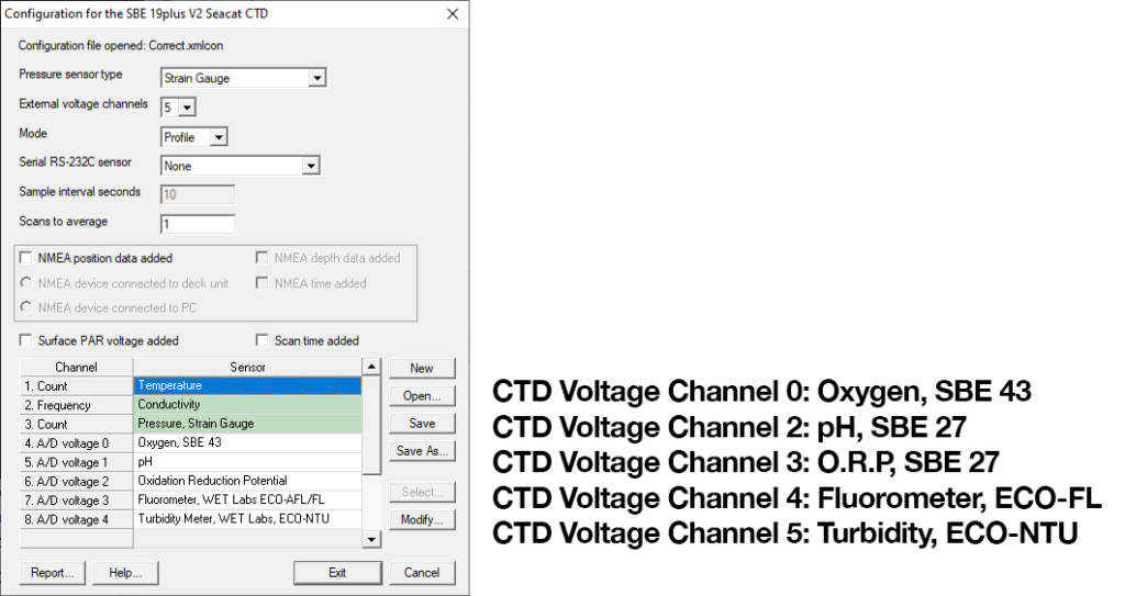 The order in which sensors appear in the configuration file must match the order that sensors are physically connected to the CTD. Note: for the 19plus V2, 16plus V2, and real-time output on the 25plus, voltage channels must be activated prior to logging data. Refer to the instrument manual for more information.