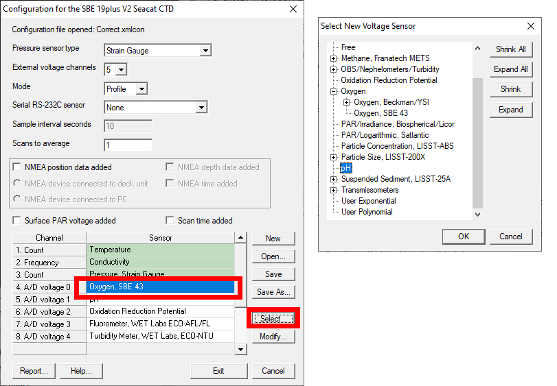Once the sensors are physically connected to the CTD, the next step is to create or modify the CTD’s .xmlcon configuration file. This file tells Seasave or SBE Data Processing how to convert the analog voltage from any auxiliary sensors to engineering units. Any changes to the CTD configuration will necessitate a change to the configuration file, or the software will fail to process the data correctly.