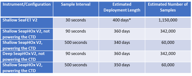 Battery endurance for our line of ISFET pH sensors varies with the sampling regime: are you transmitting data in real-time? Do you have a CTD? Are you powering that CTD from its own batteries, or from the SeaFET? We stepped through some power estimations for create the table below, assuming a sensor with brand-new batteries is deployed in 17 °C water.