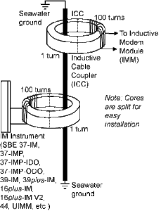 An Inductive Modem Module (IMM) uses electrical current loops to transmit information; current flowing in a wire loop induces current to flow in a loop that passes through it. In Sea-Bird's IM system: