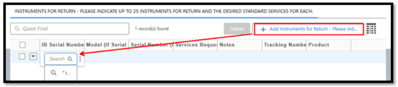 7. To add sensors for service, click Add instrument for Return, and then search for the SN (Installed Records).