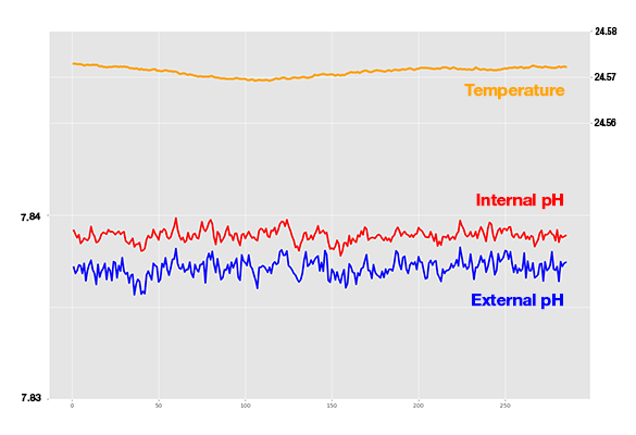 The data above originate from a SeaFET pH sensor connected to a flow-through system that should provide stable, consistent data. As you can see, the Internal pH value experiences a dramatic drop in pH and a subsequent increase in noise midway through data collection. The External pH values match samples from a spectrophotometer. Temperature remains stable during the shift in Internal pH, indicating that the flow-through system continued to provide a consistent seawater supply.