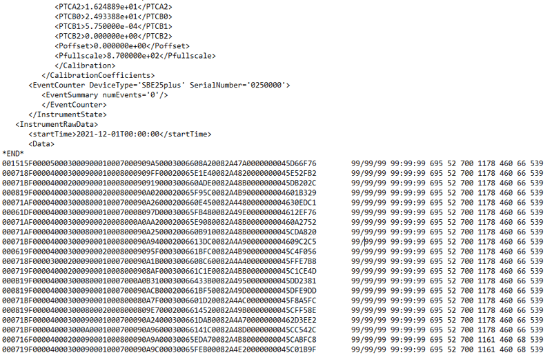 After the cast, the serial data is stored in the 25plus internal memory, either inline with the CTD data or as a separate .txt file. When stored inline, the full output string from the RS-232 sensor is printed next to the hexadecimal data in the CTD’s .xml data file