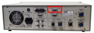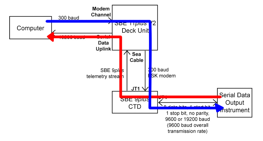 The serial uplink channel can handle RS-232 data at 9600 baud, or data transmit at 19200 baud with intervals of no data transmission (for an average transmission rate not to exceed 960 bytes/second). When connected and configured, the RS-232 data from the sensor can be captured by software via the the “Serial Data Uplink” connector on the back of the 11plus V2 deck unit. This data stream is separate from the 9plus CTD data stream.