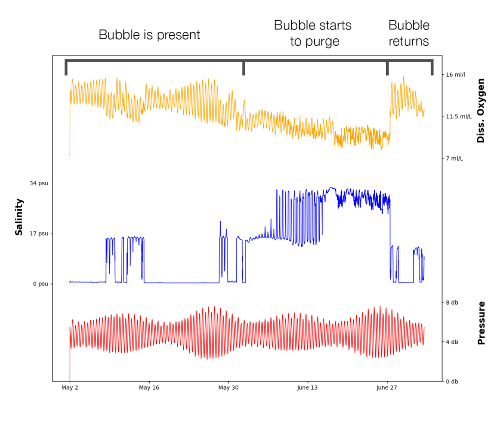 - Bubbles were caught in the flow path, likely due to preexisting fouling. When an electrode in the conductivity cell is encased in a bubble, conductivity measurements will drop to zero. When bubbles are trapped near the dissolved oxygen sensor, it is common to see a pattern that follows the tidal cycle; increasing/decreasing pressure causes the bubbles to expand and contract, which is picked up by the sensor.